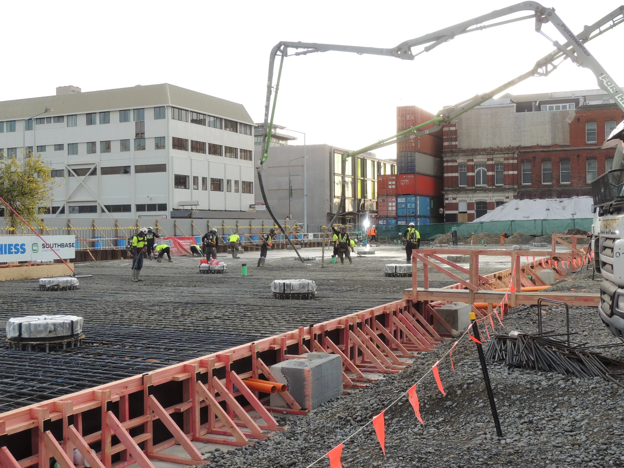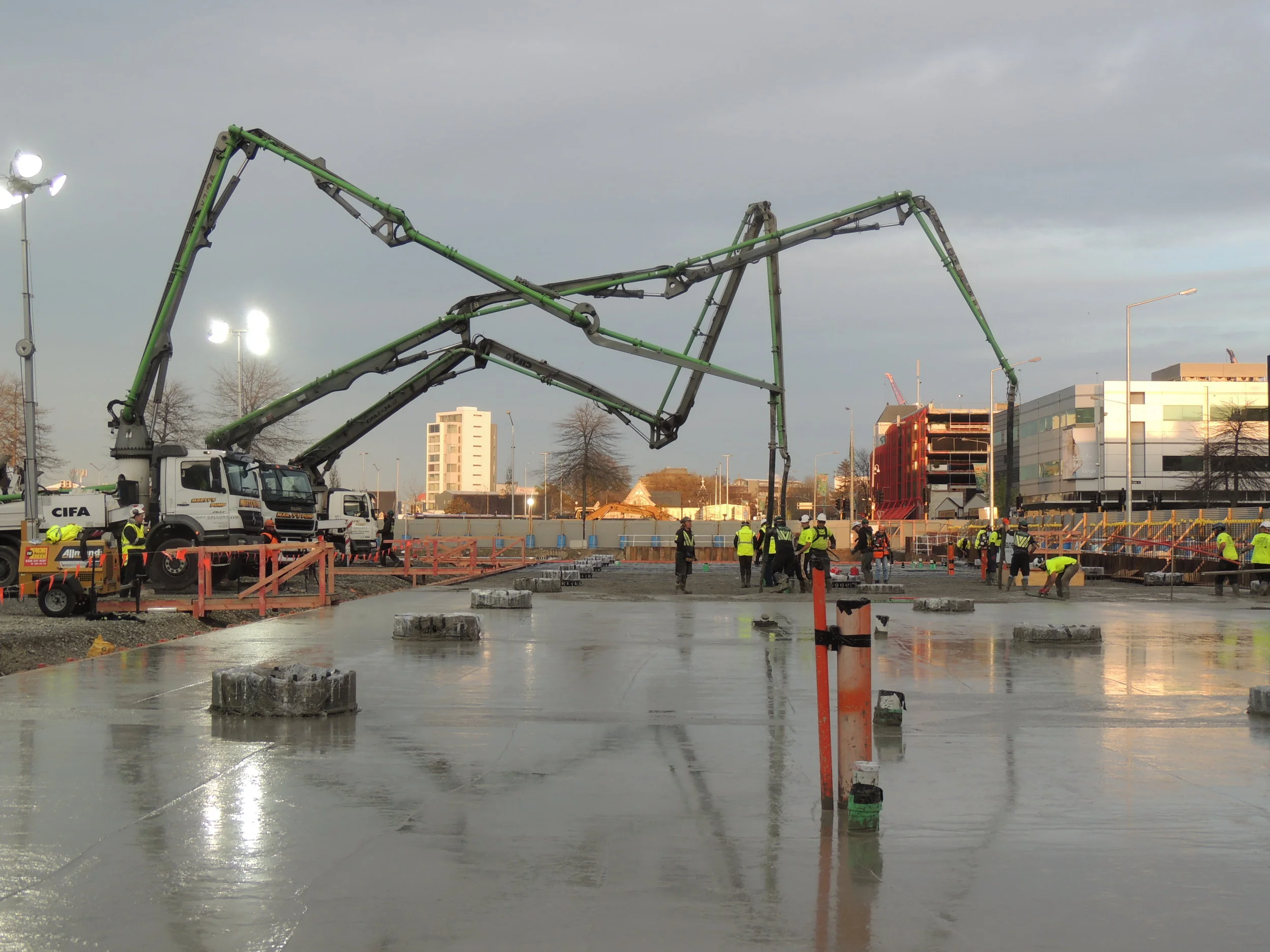 The pour is the foundation for the city’s new bus exchange and is one of the key anchor projects for Christchurch signalling a significant moment for the city's rebuild. The pour of the 900mm deep slab on the 90m by 16m site comprised of 235 truck loads averaging 76 minutes per trip. The first load was batched at 2.06am with the last truck returning to the yard at 11.54am.